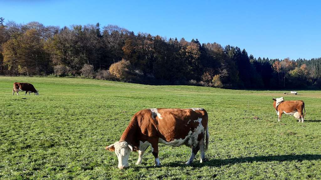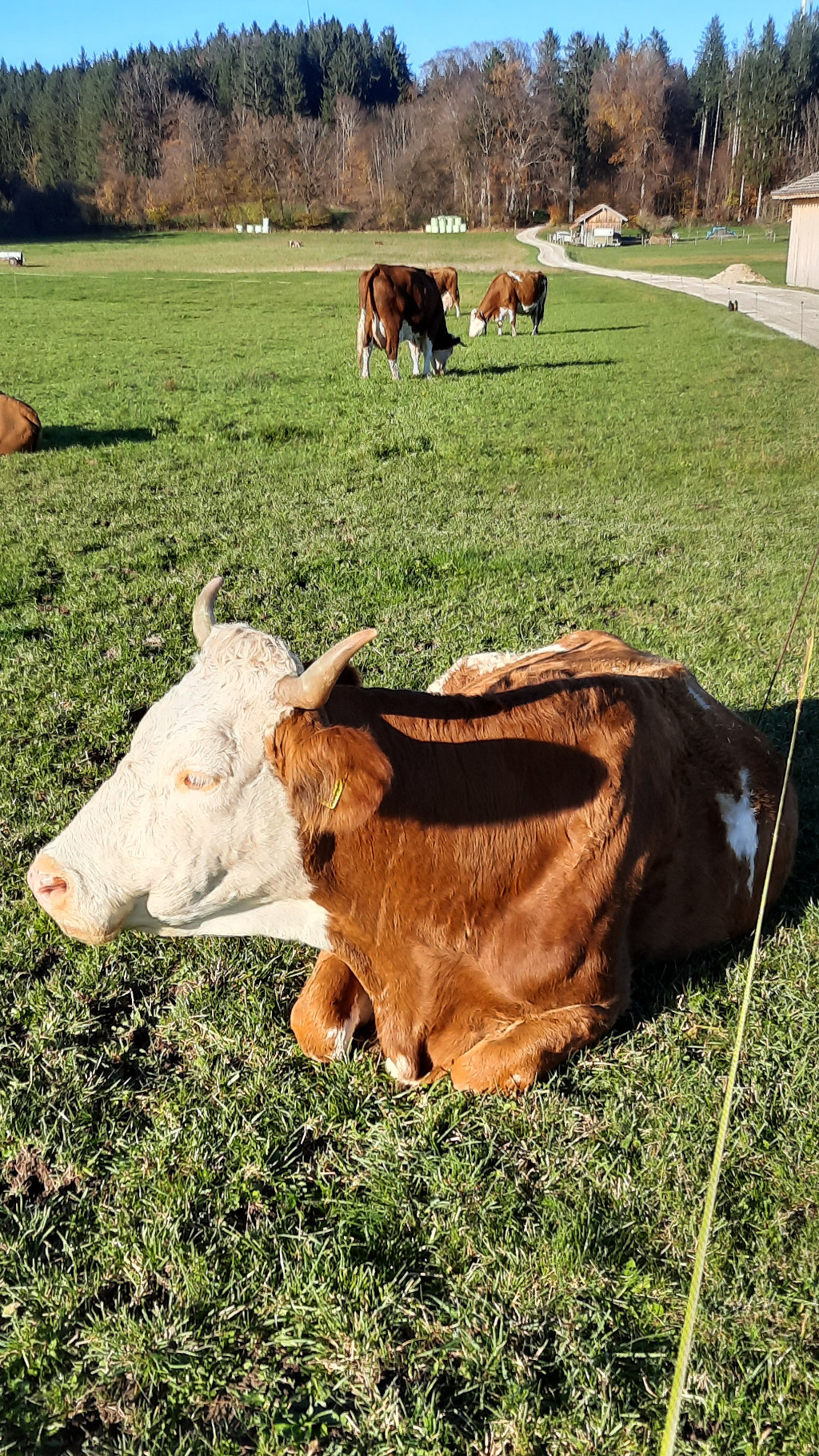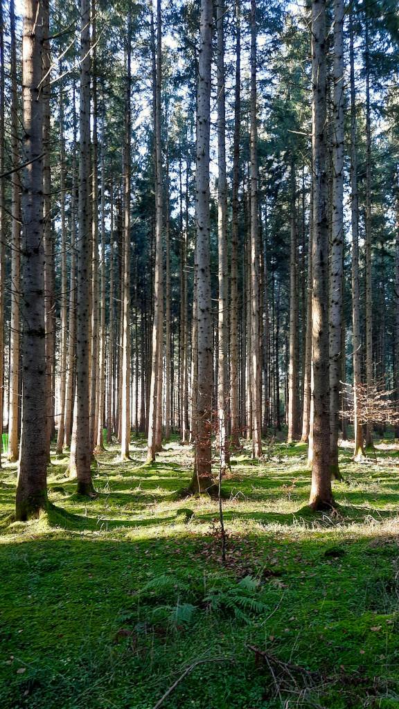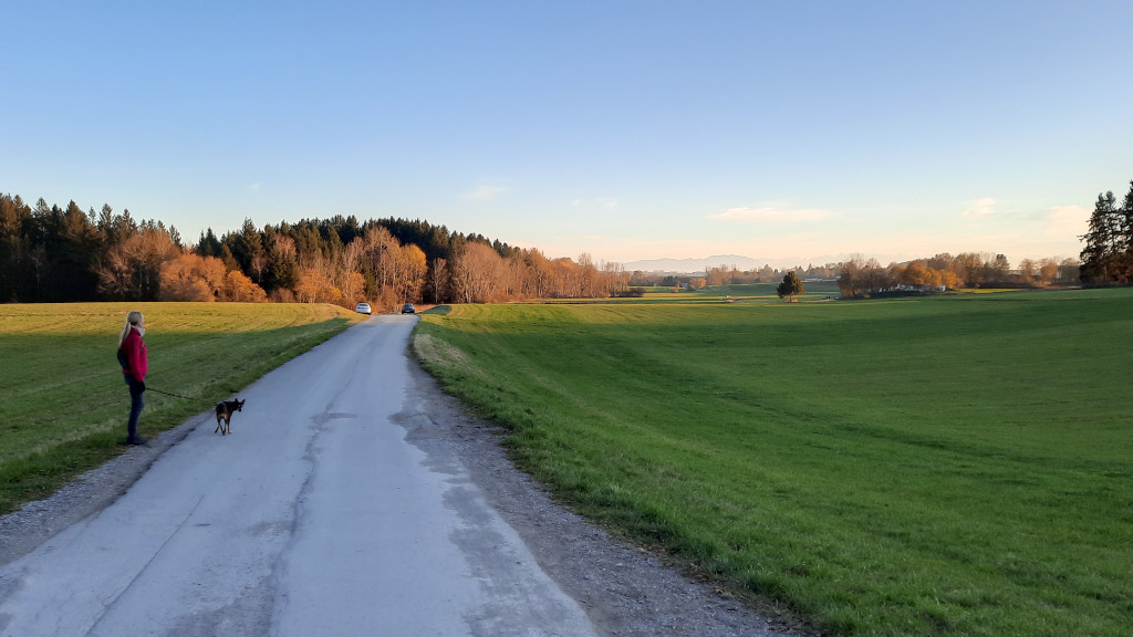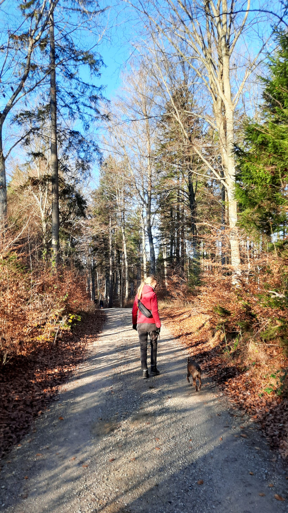 In der Forststrasse in Mörlbach bei Berg geparkt, unsere Hündin an die Seite und los an einer großen Wiese mit riesen Kühen mit riesen Eutern vorbei in den Wald.